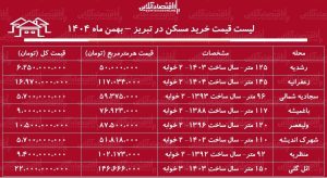 قیمت یک واحد ۱۵۰ متری سه خوابه با سال ساخت ۱۴۰۳، در منطقه مرفه نشین «ائل گلی» ۲۲ میلیارد تومان تعیین شده است. همچنین، واحد دیگری به متراژ ۱۱۷ متر دو خوابه با سال ساخت ۱۳۸۸، در «باغمیشه» با قیمت ۹ میلیارد تومان معامله میشود.